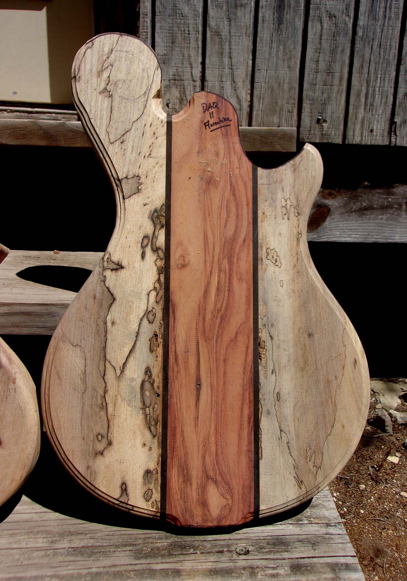 D’AQUILA #011 - Venetian model, spalted Texas pecan wings, bloodwood-on-mahogany center, ebony stringers. Mahogany neck with ebony fretboard and lots of ebony trim pieces coming, as well as some turquoise inlays on the body & headstock. Stay tuned for more working photos, this one will be finished later this year. (The D’AQUILA GUITARS page is coming.) ($ INQUIRE)